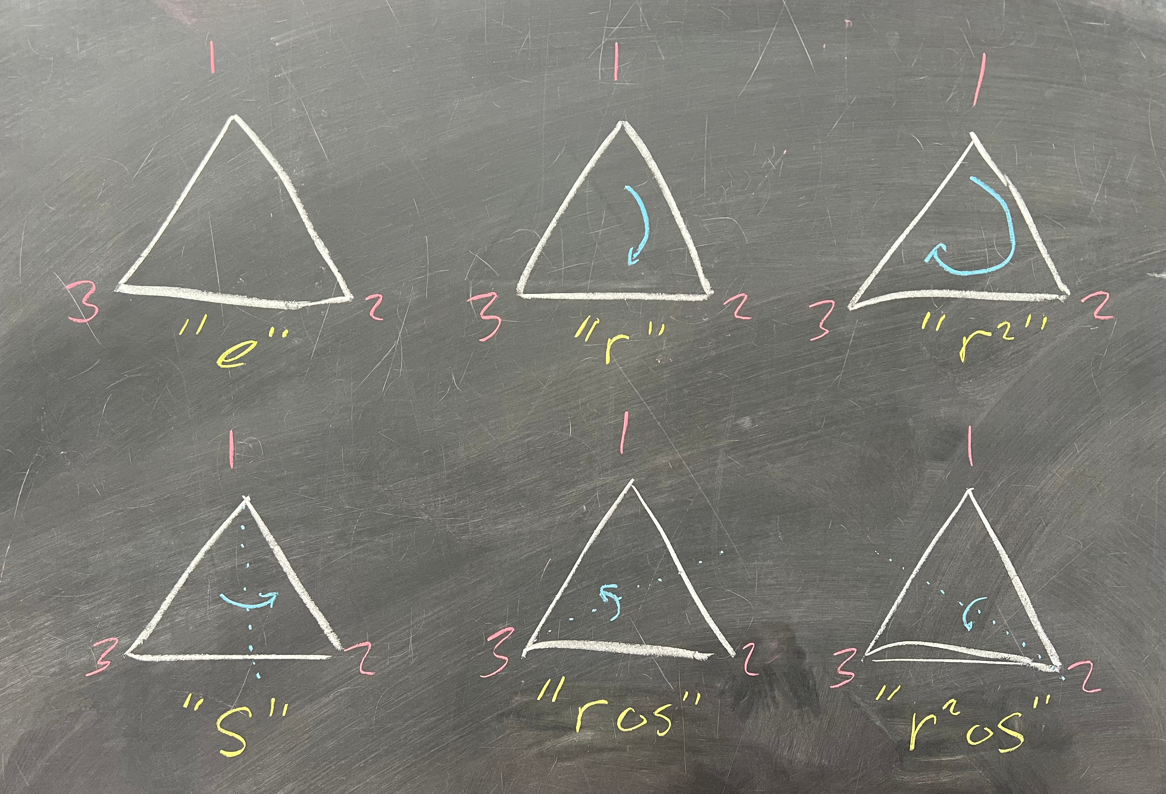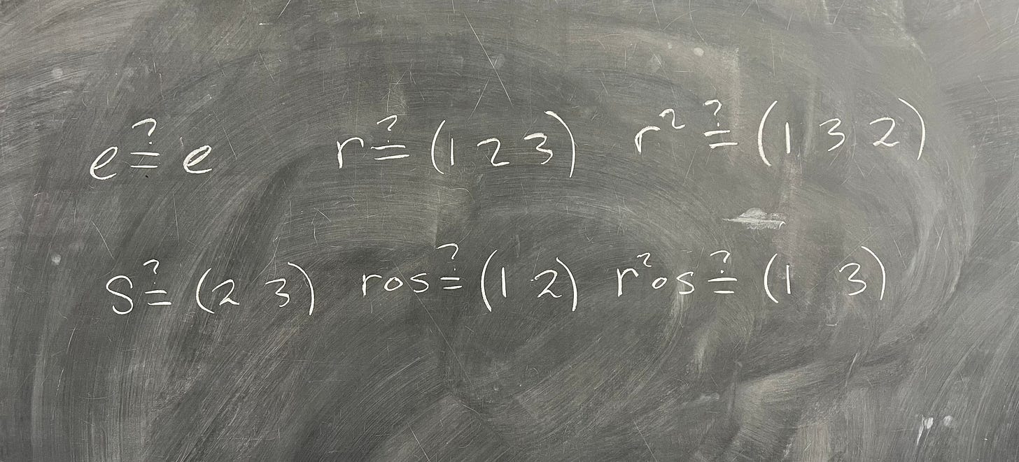 I held off on answer this exercise last week because secretly, that exercise was a hint of what we’re doing today. Let's flesh this exercise out now. For a refresher, recall that D_6 is the group of symmetries of a triangle: