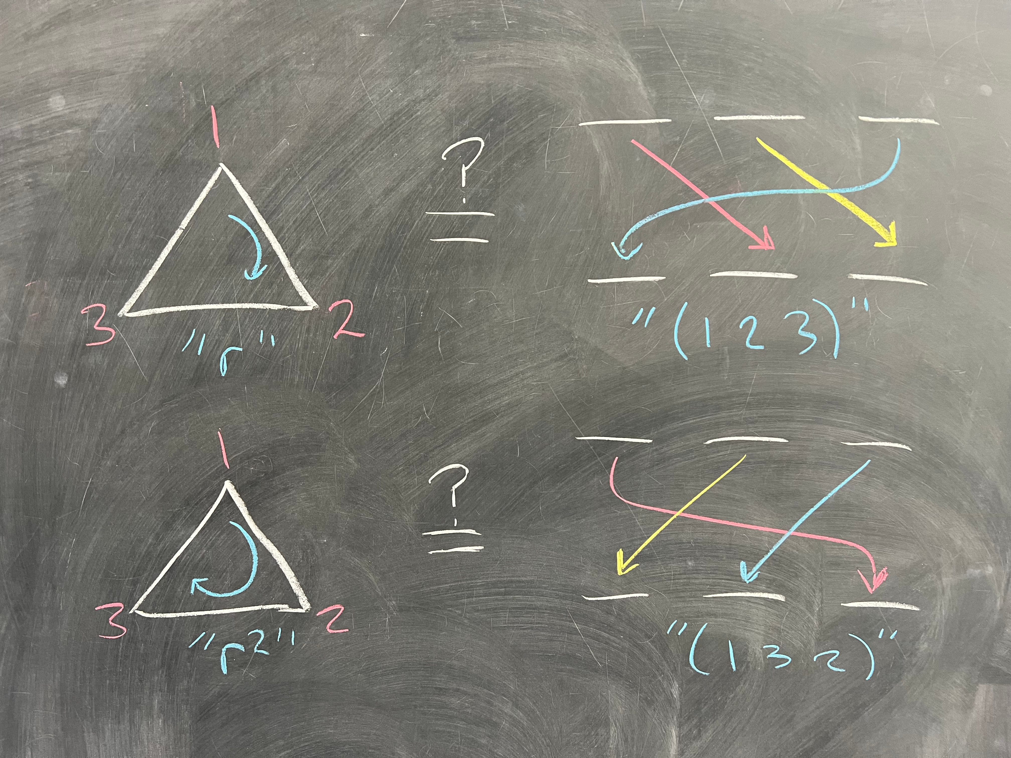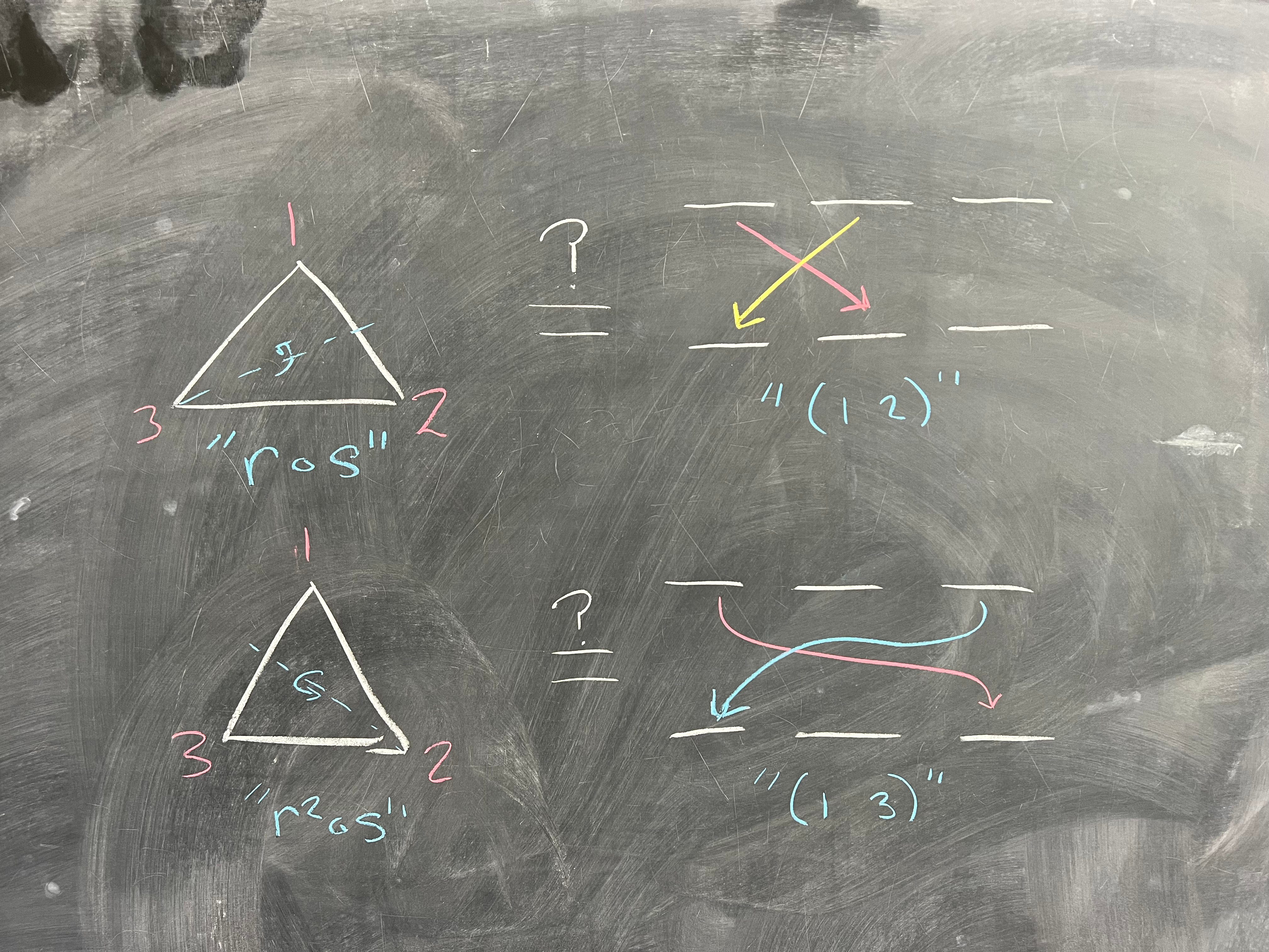 Great, so all the swaps in S_3 correspond to reflections in D_6. What about the cycles? If your intuition is especially good, you might spot that cycles are the same as our rotations: