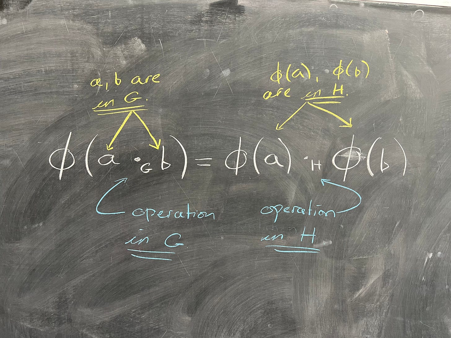 (The weird circle thing is the greek letter phi, which is standard notation for this.) Now, I realize you're probably confused by the •_G and the •_H. I put those there because I am emphasizing that on the left, the operation inside the phi is the binary operation for the group G, while on the right, the binary operation is the operation for the group H.