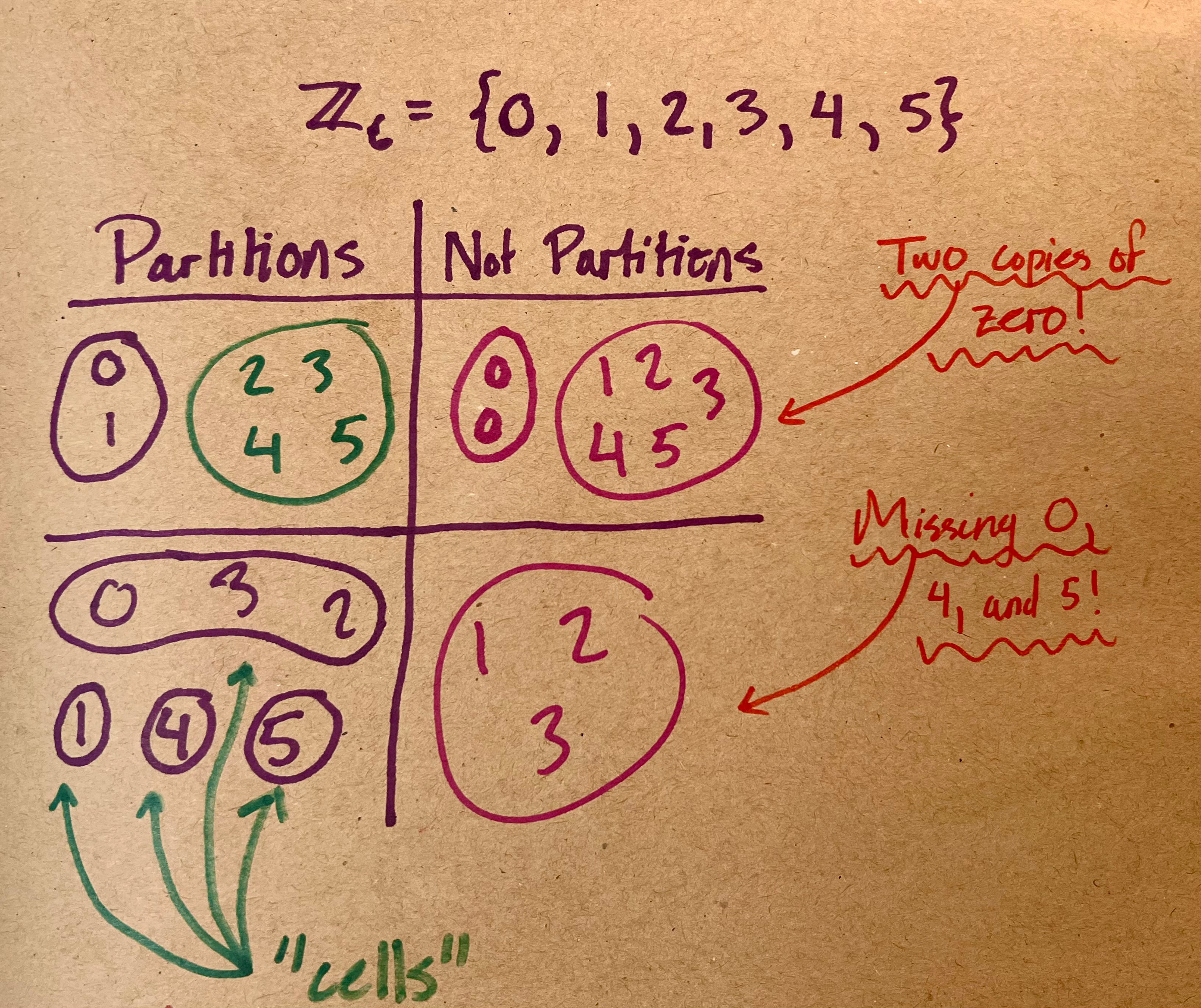 Here we see a couple partitions of the group ℤ₆, and a couple examples of things that do not partition ℤ₆. The partitions both have every number in ℤ₆ precisely once; the non-partitions either have more than one copy, or are missing some numbers. Additionally, the partitions of ℤ₆ divide everything into piles that do not overlap - in the first partition, if 2 were in both the green and the purple pile, then it would not be a partition.