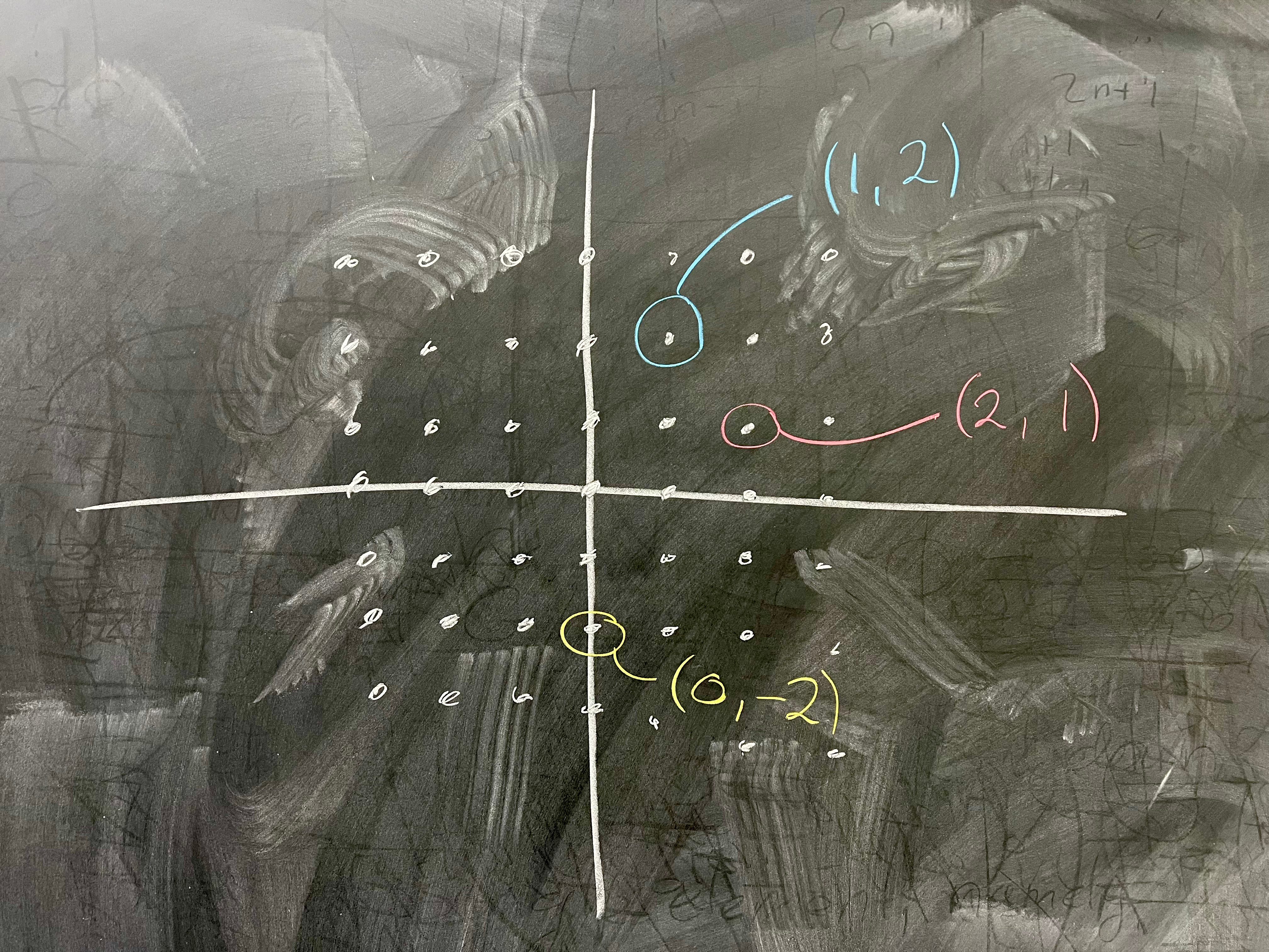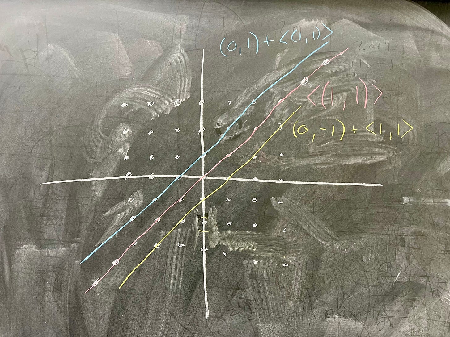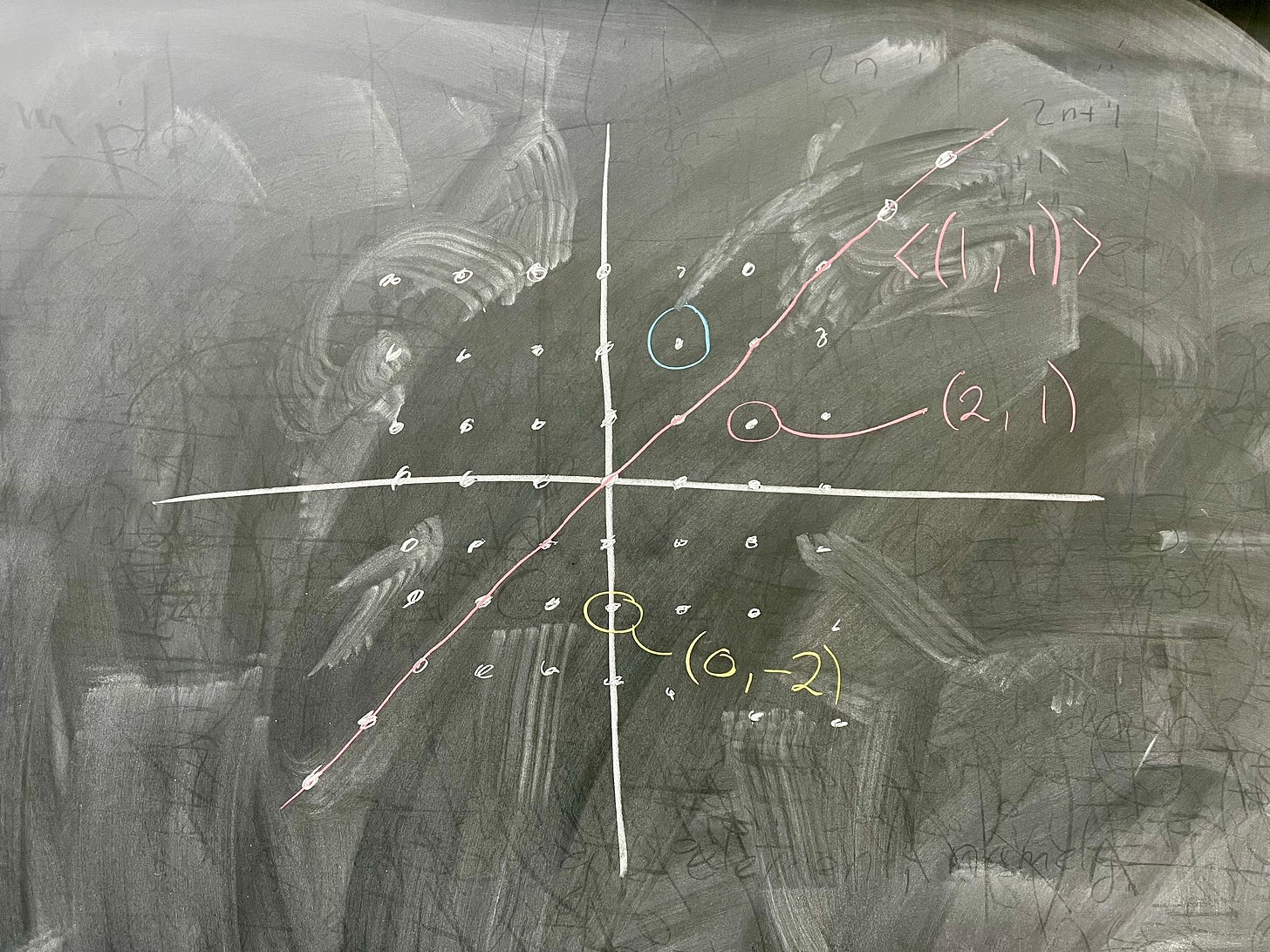 The best picture to have of this group is this grid of integer points in the plane. What does ⟨(1, 1)⟩ look like in this picture? Well, it's all points of the form n(1, 1) where n ∈ ℤ. This is of course the same as the points (n, n), so our picture looks like this: