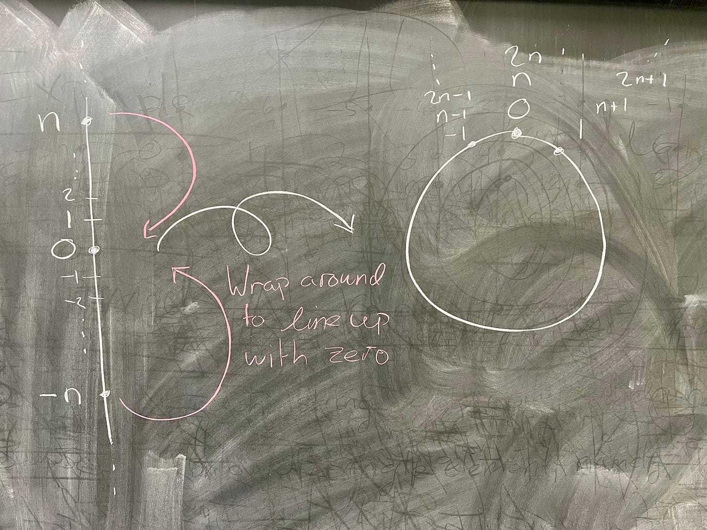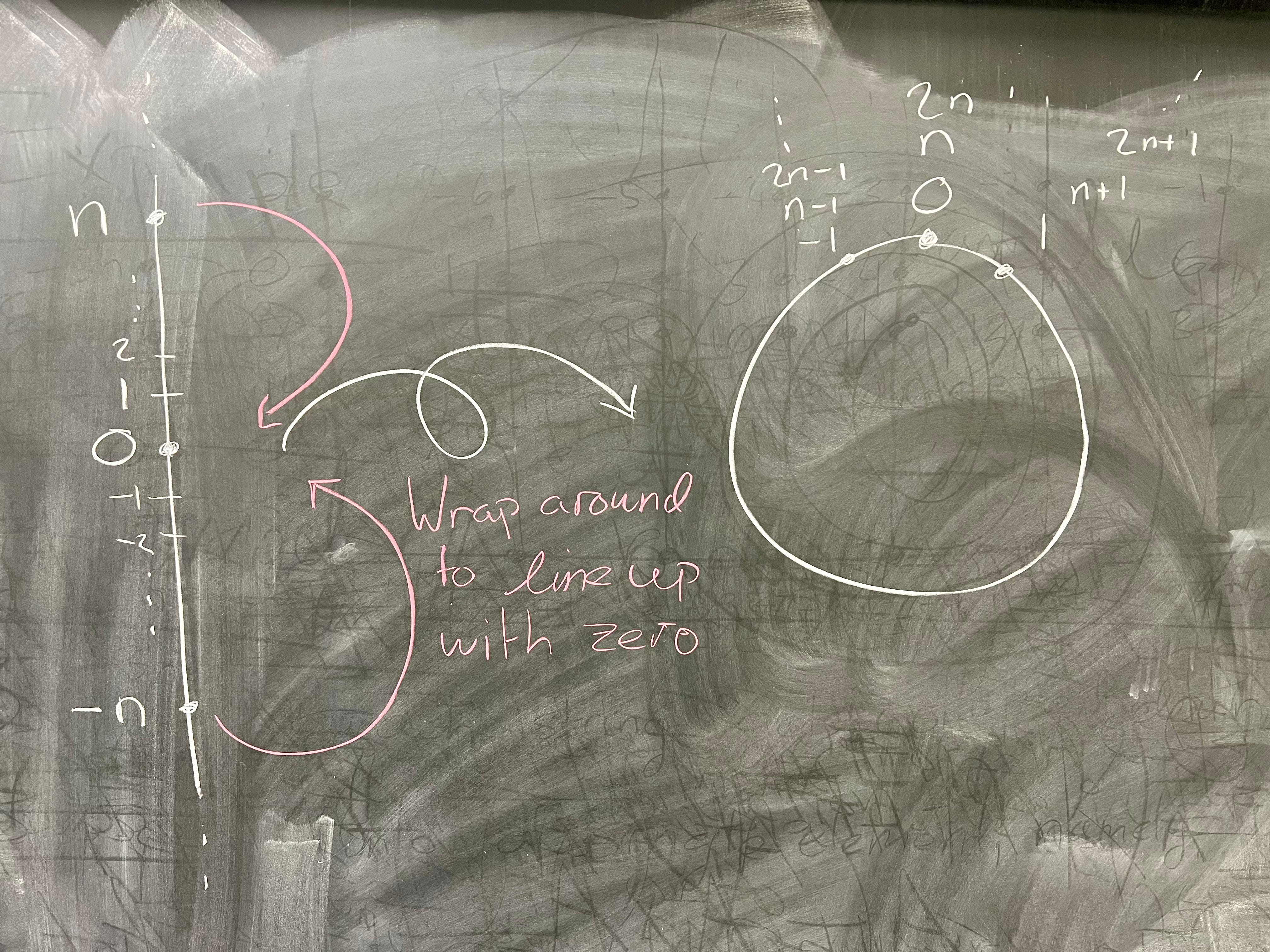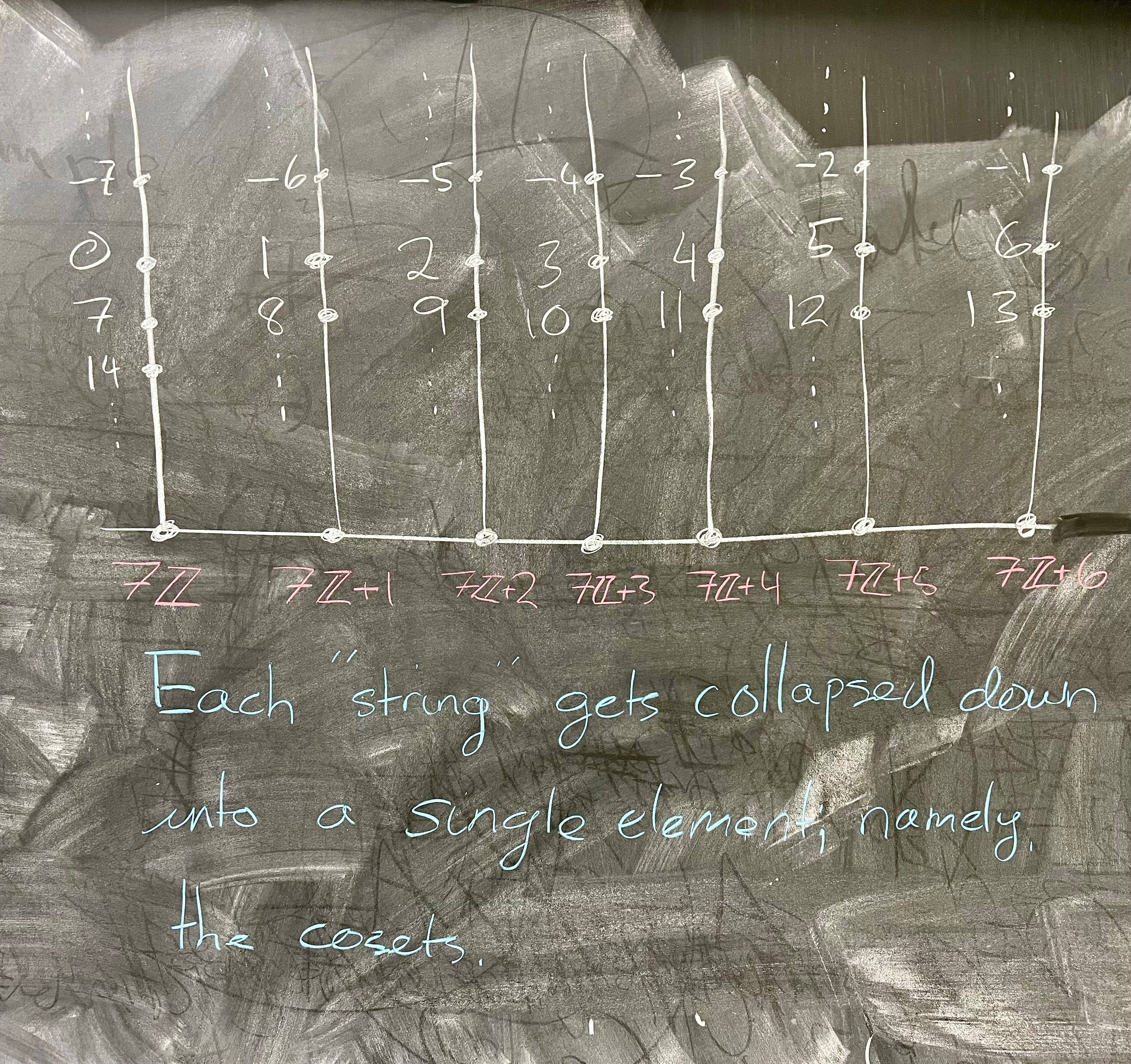 One way you could think about this coset operation is, once you know that the operation on your "colors" are well−defined, you can pick an element of each color to represent that color. This is exactly what we're doing when we go from ℤ/nℤ to ℤₙ. 0 in ℤₙ corresponds to the coset 0 + nℤ – in other words, 0 is the representative for that coset. Similarly, 1 in ℤₙ is the representative for the coset 1 + nℤ in ℤ/nℤ.